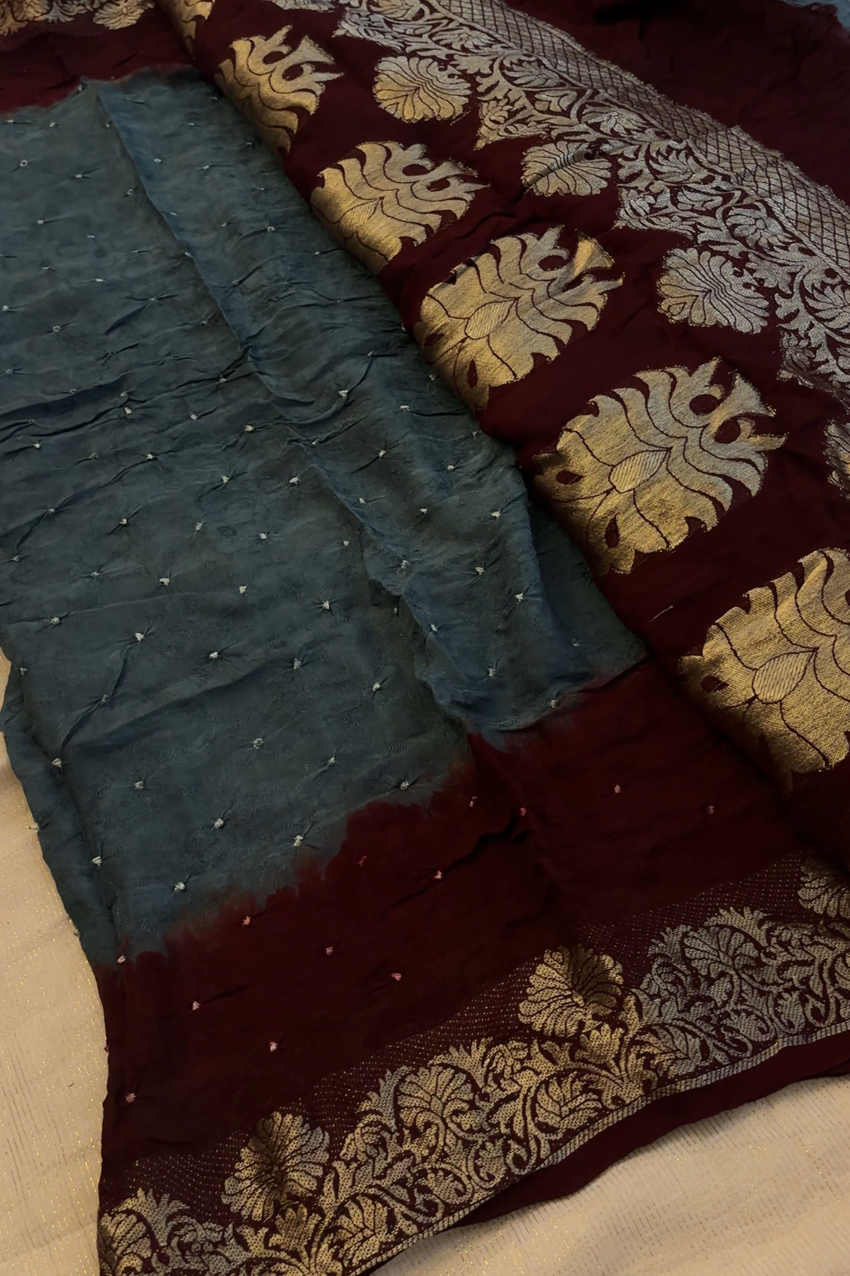 Bandhani saree in a rich deep grey body beautifully contrasted with a deep maroon pallu and an elegant woven border. The classic tie-dye motifs add timeless charm, making it perfect for festive occasions . Crafted with heritage detailing, this saree effortlessly blends earthy tones with royal elegance.