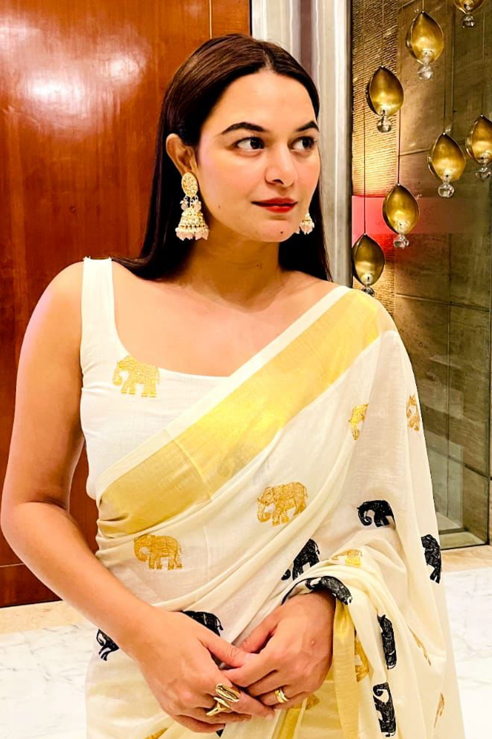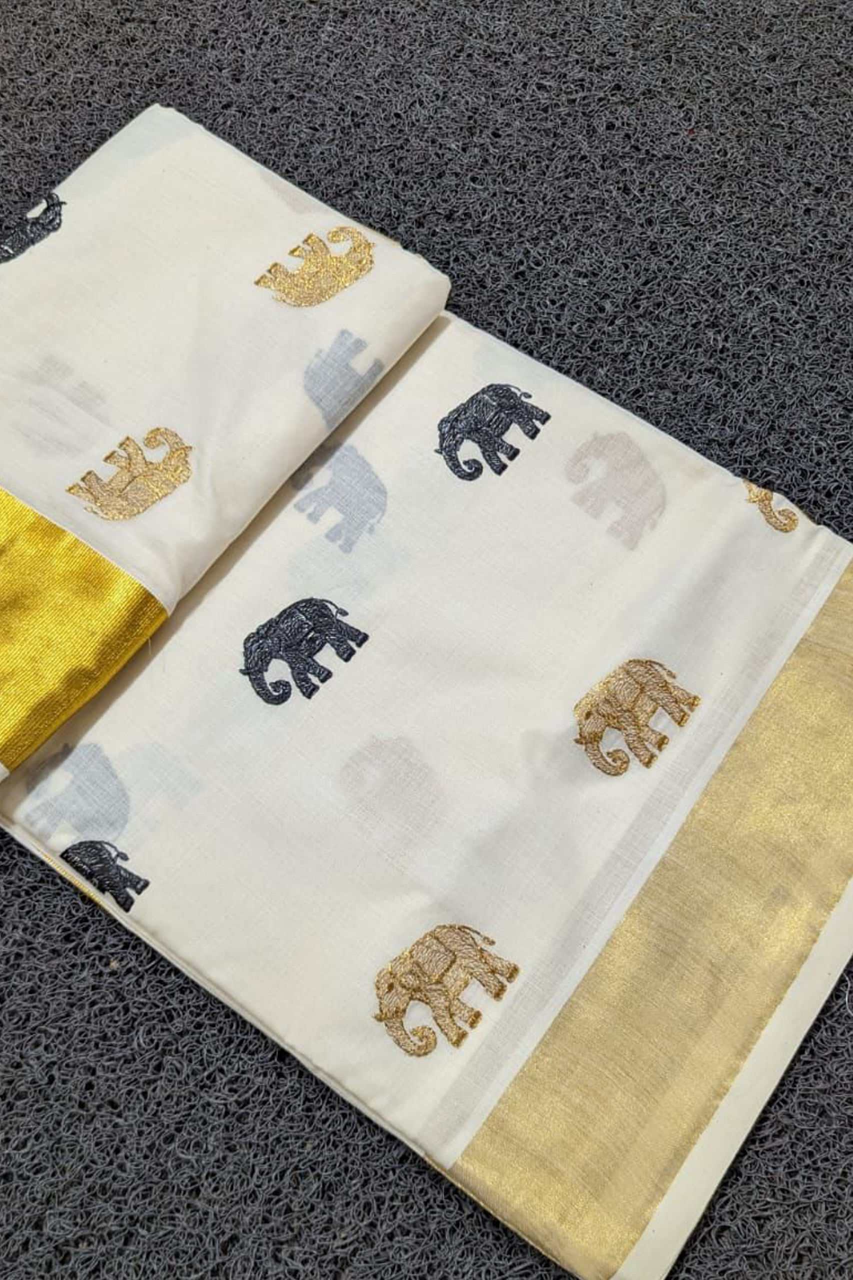 Kerala Kasavu Elephant Embroidery Saree With Running Blouse.