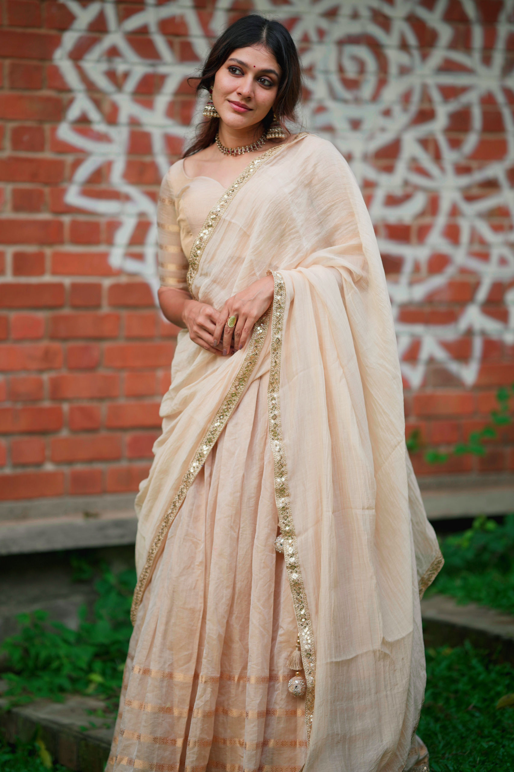 Handloom Maheshwari tissue silk skirt and blouse paired with a Mul chanderi duppatta embellished with an antique sequence border