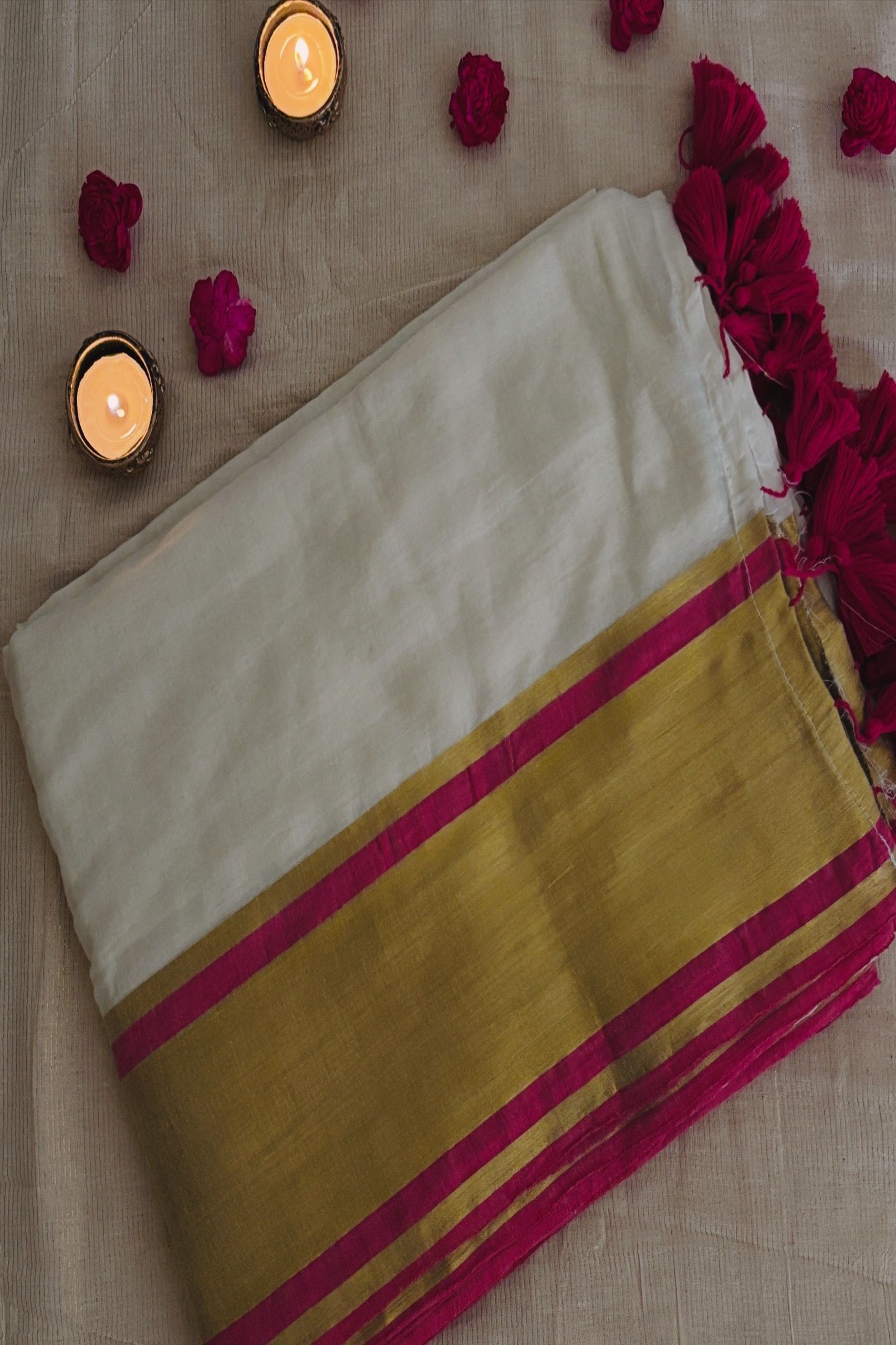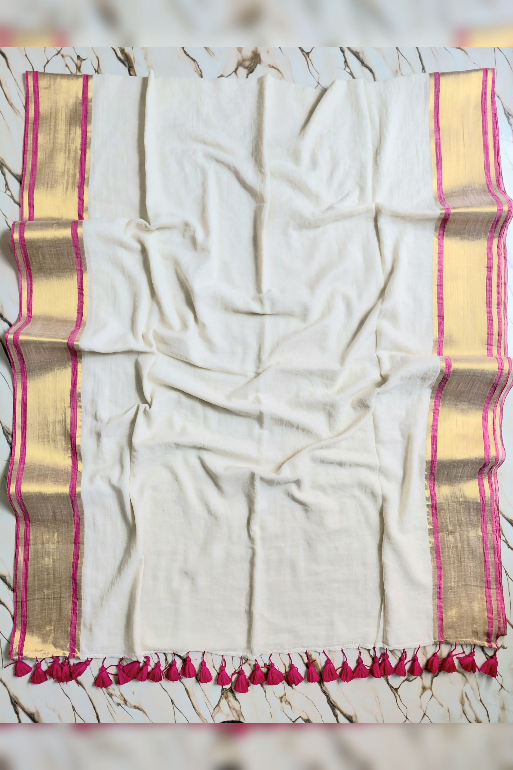 120 count soft mul cotton saree with gold Zari Kasavu and pink border.