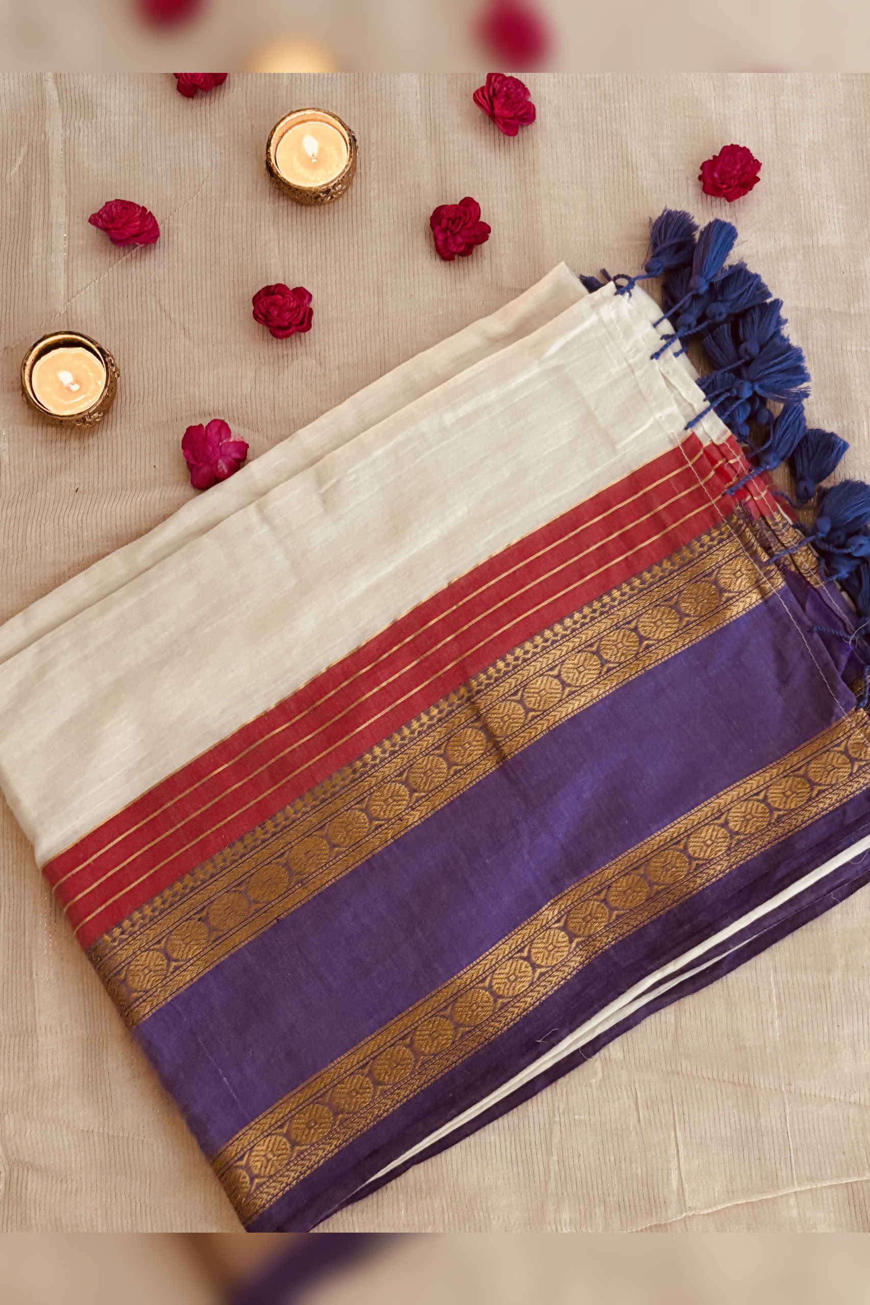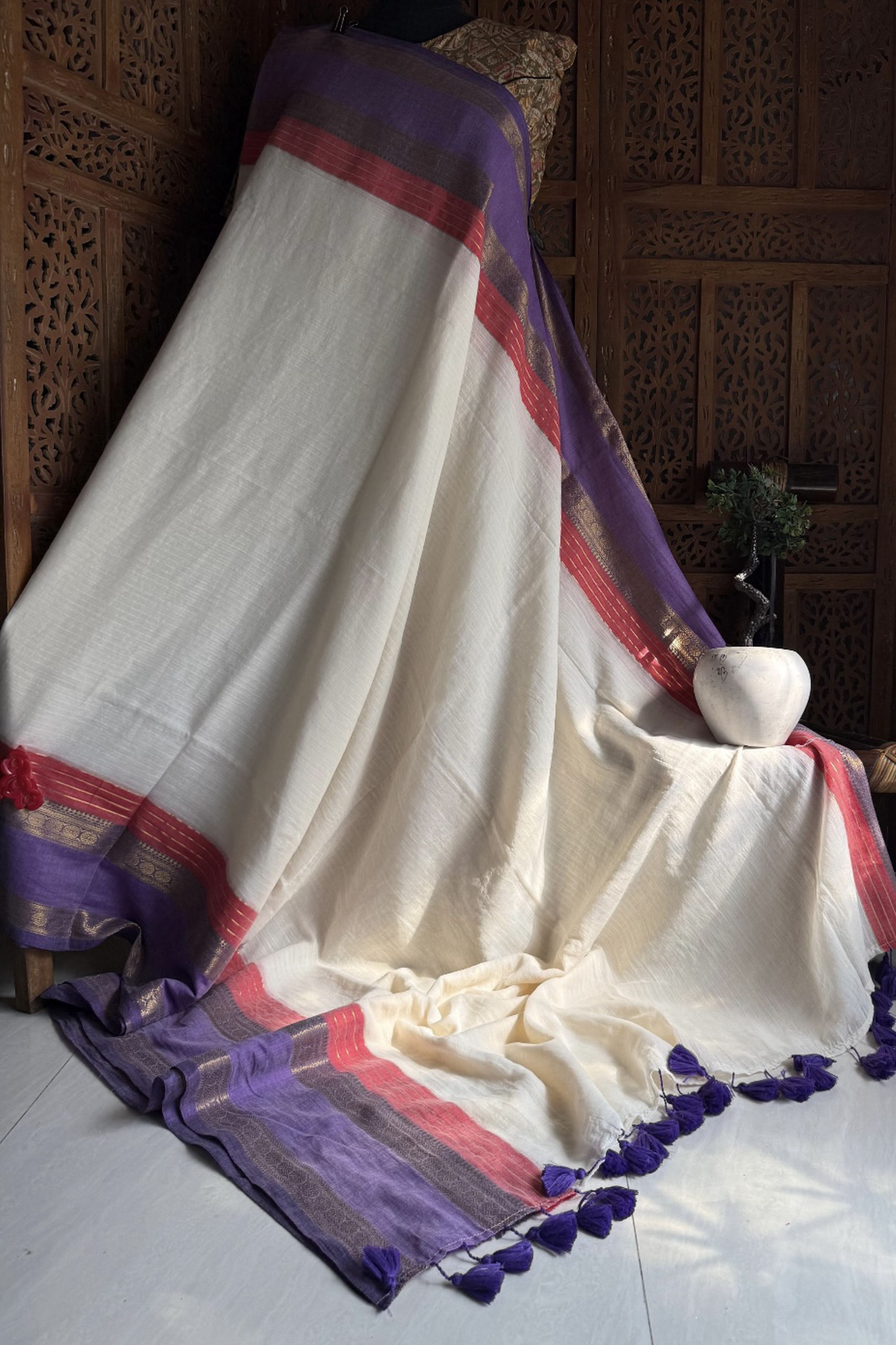Soft 120 count Mul cotton saree with purple and red border with zari weaving and attached blouse