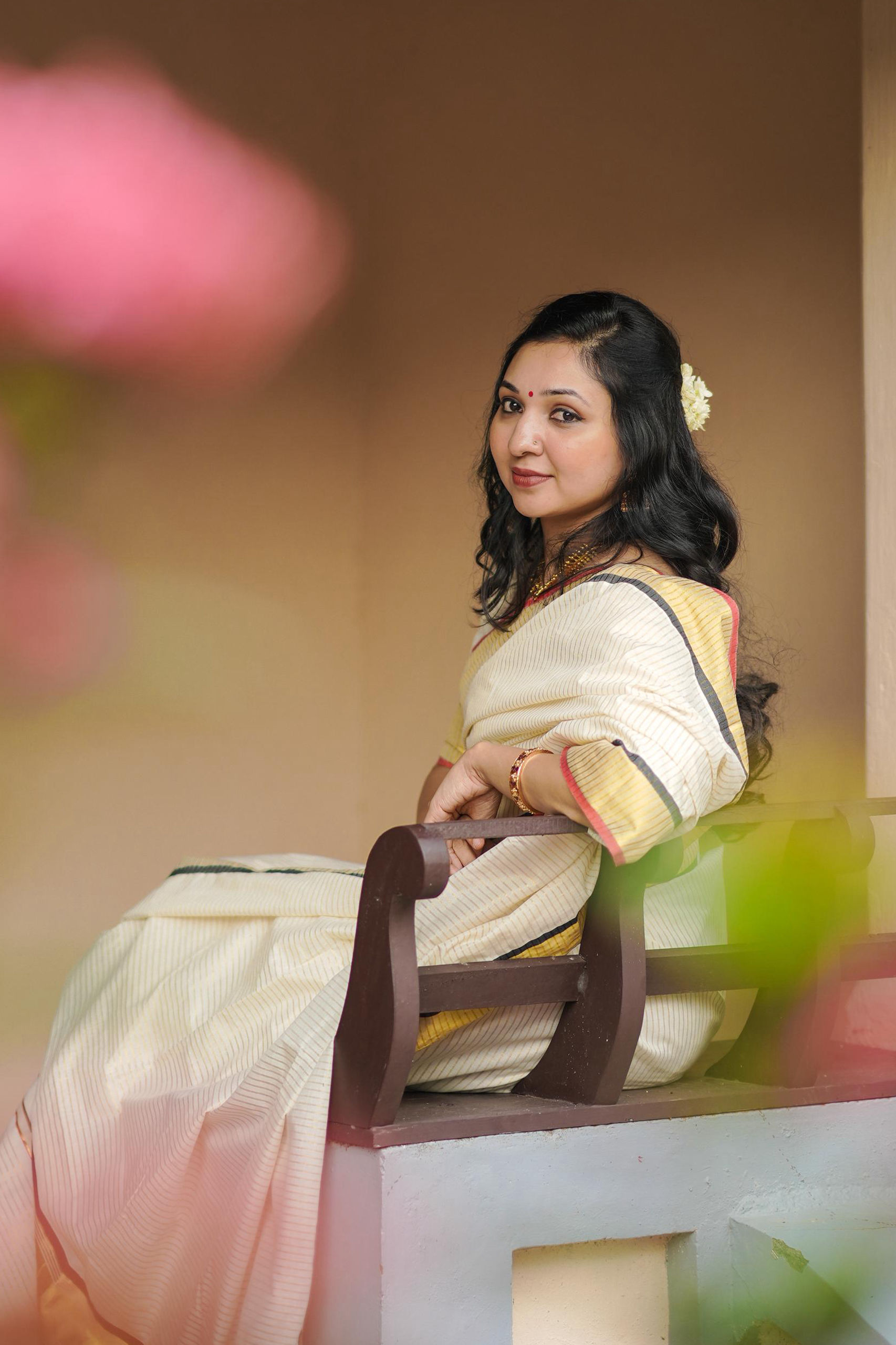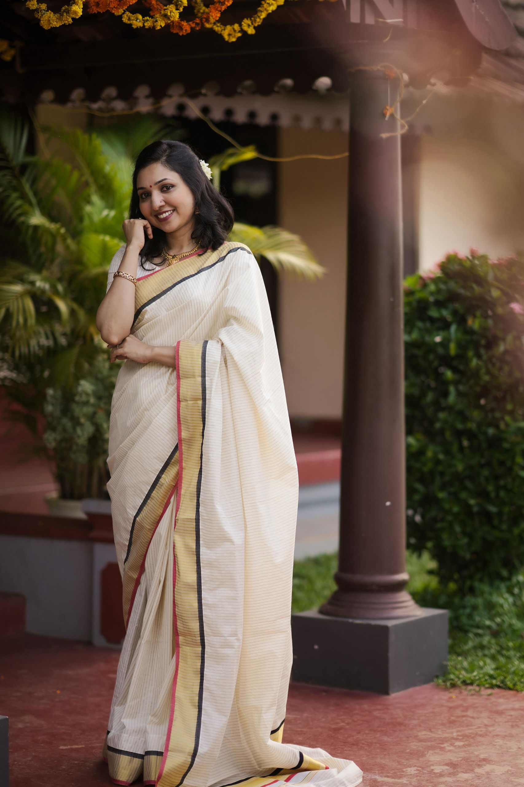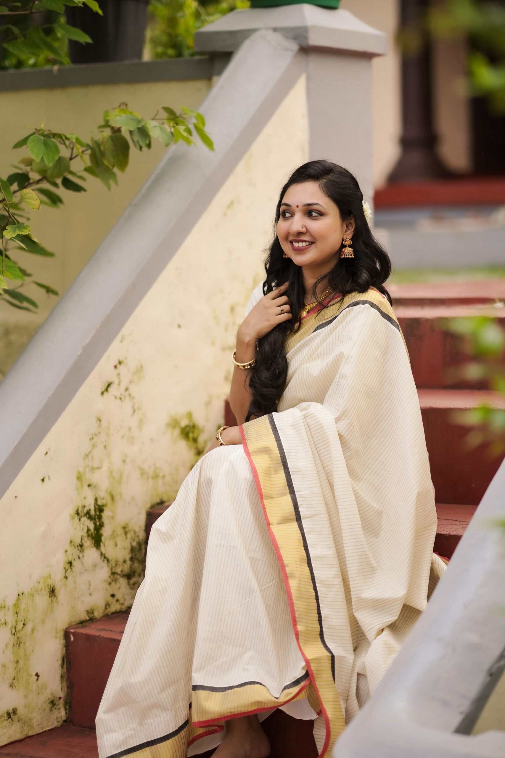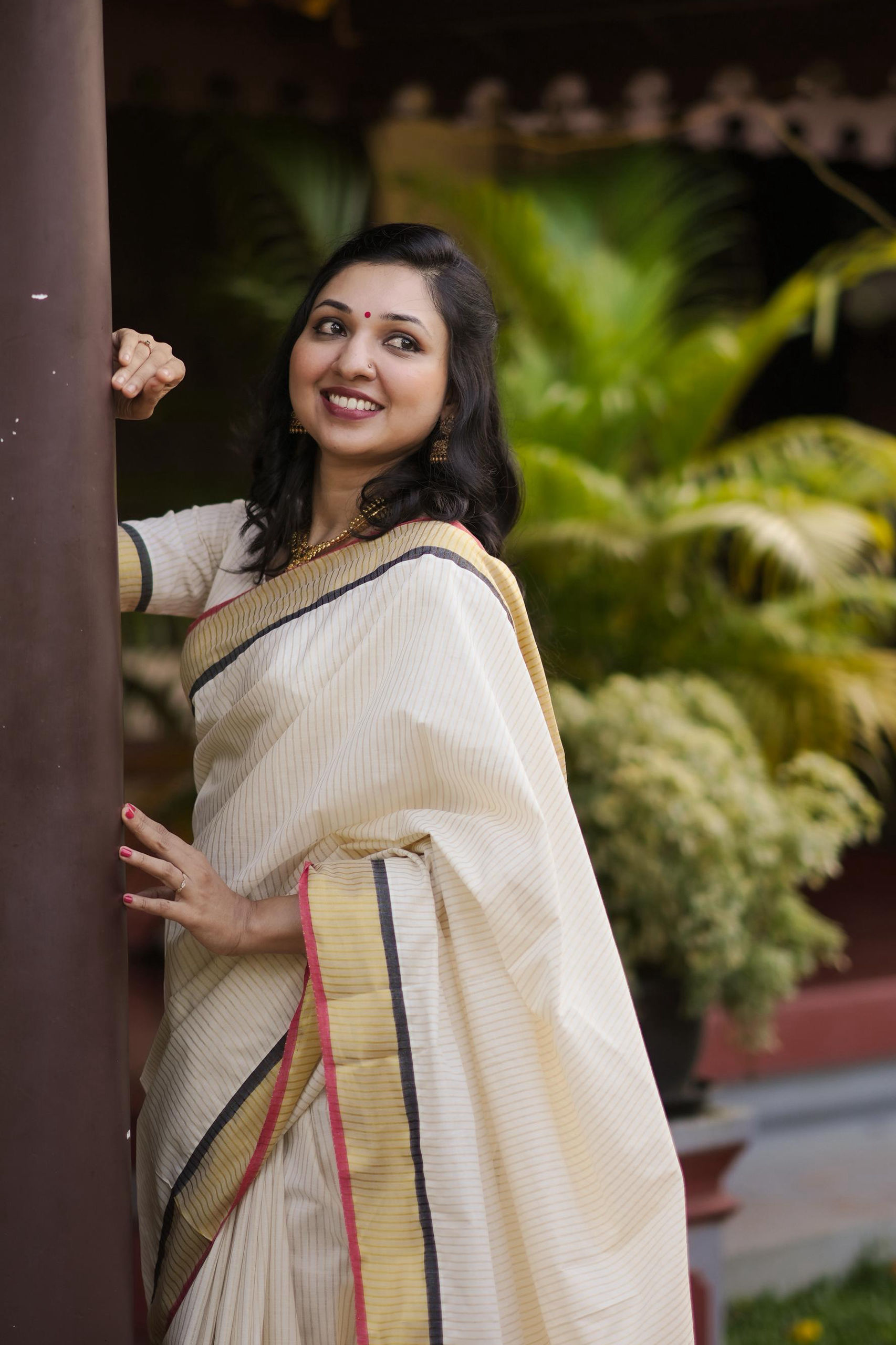 Kerala Kasavu Premium Soft Cotton Powerloom Saree With Striped Zari Weaving All Over With Rich Border.