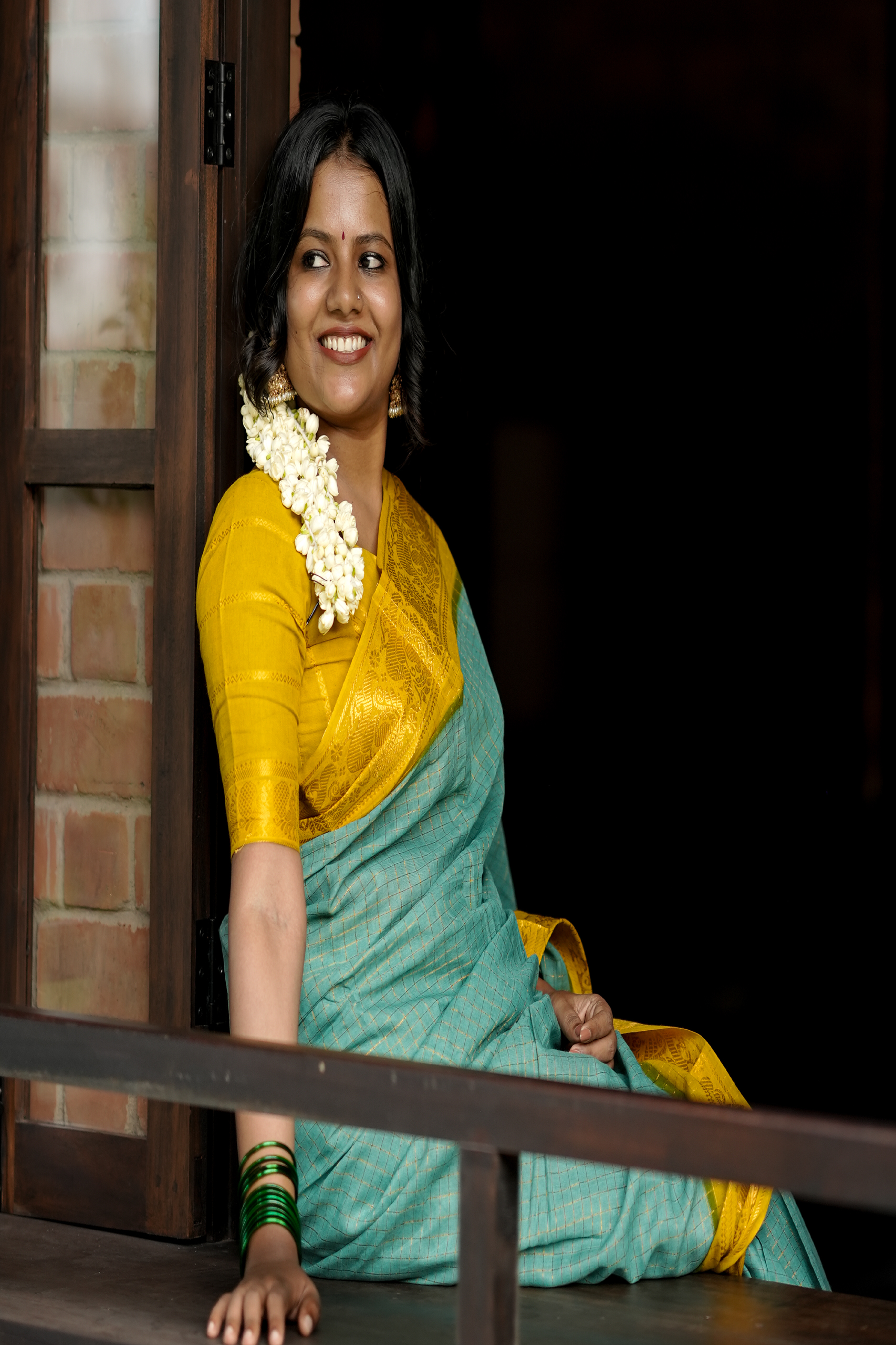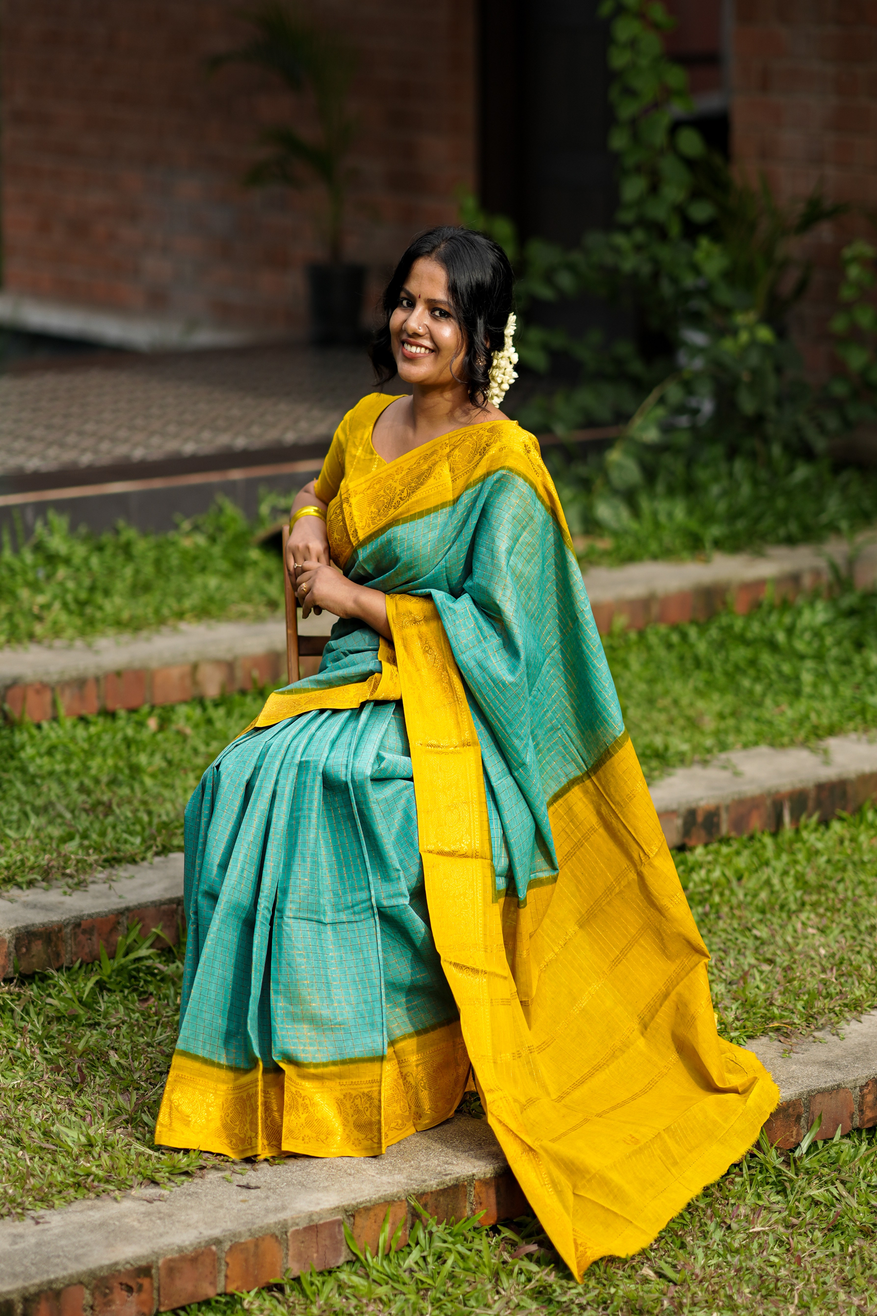 Madurai sungudi check pattern cotton saree with contrast border and contrast blouse