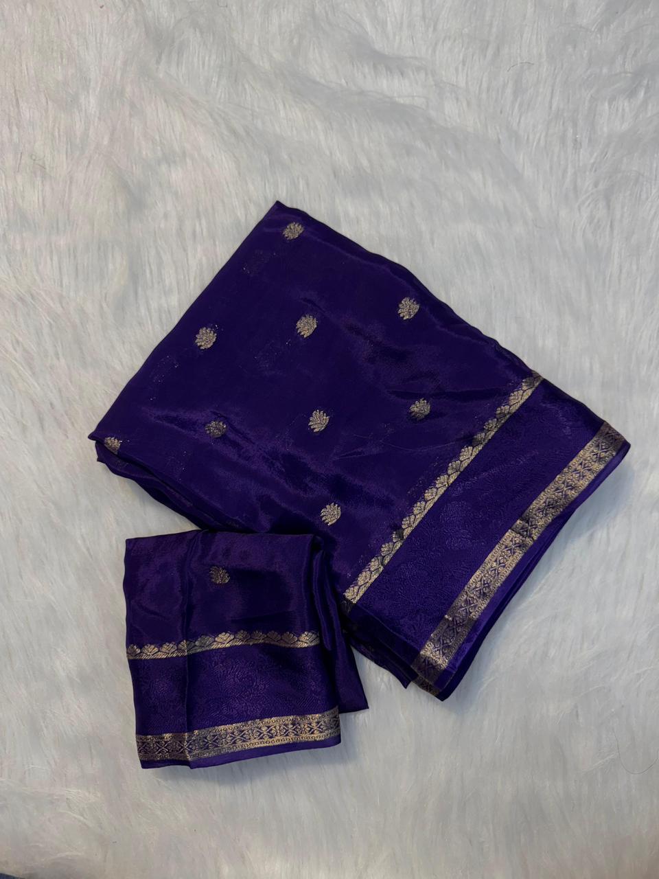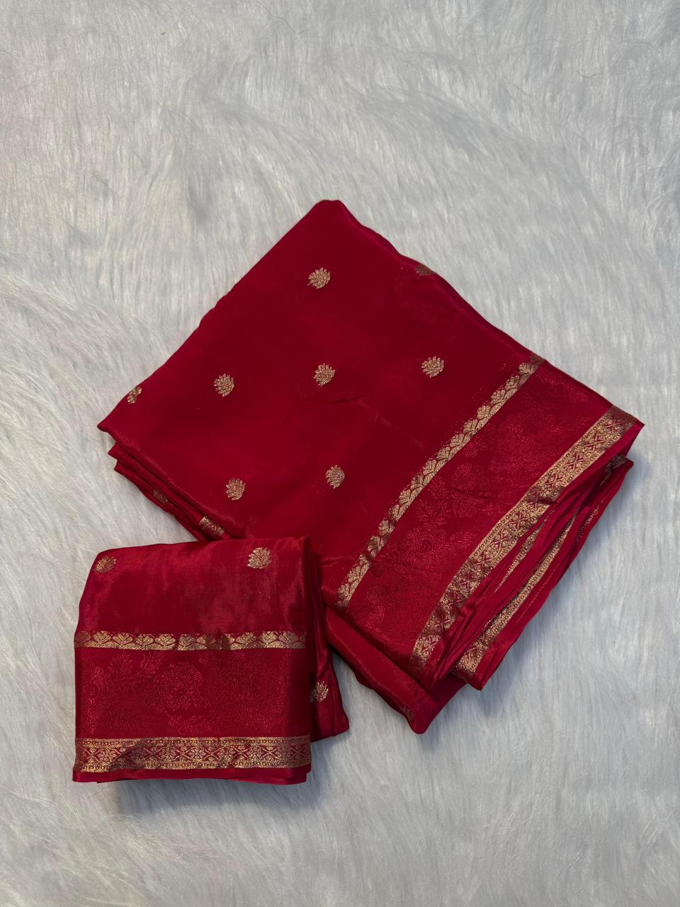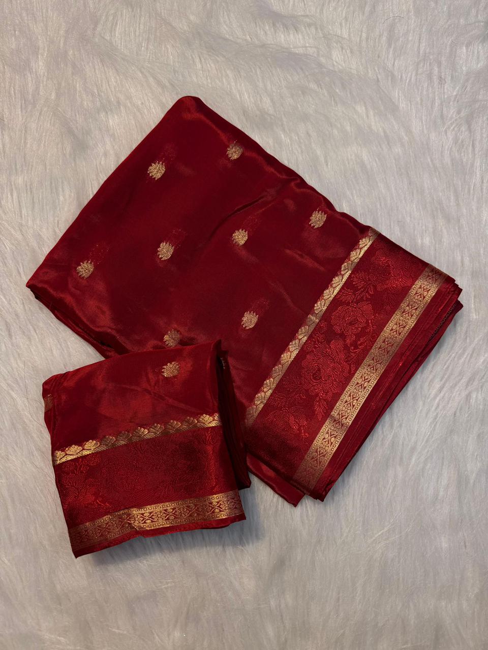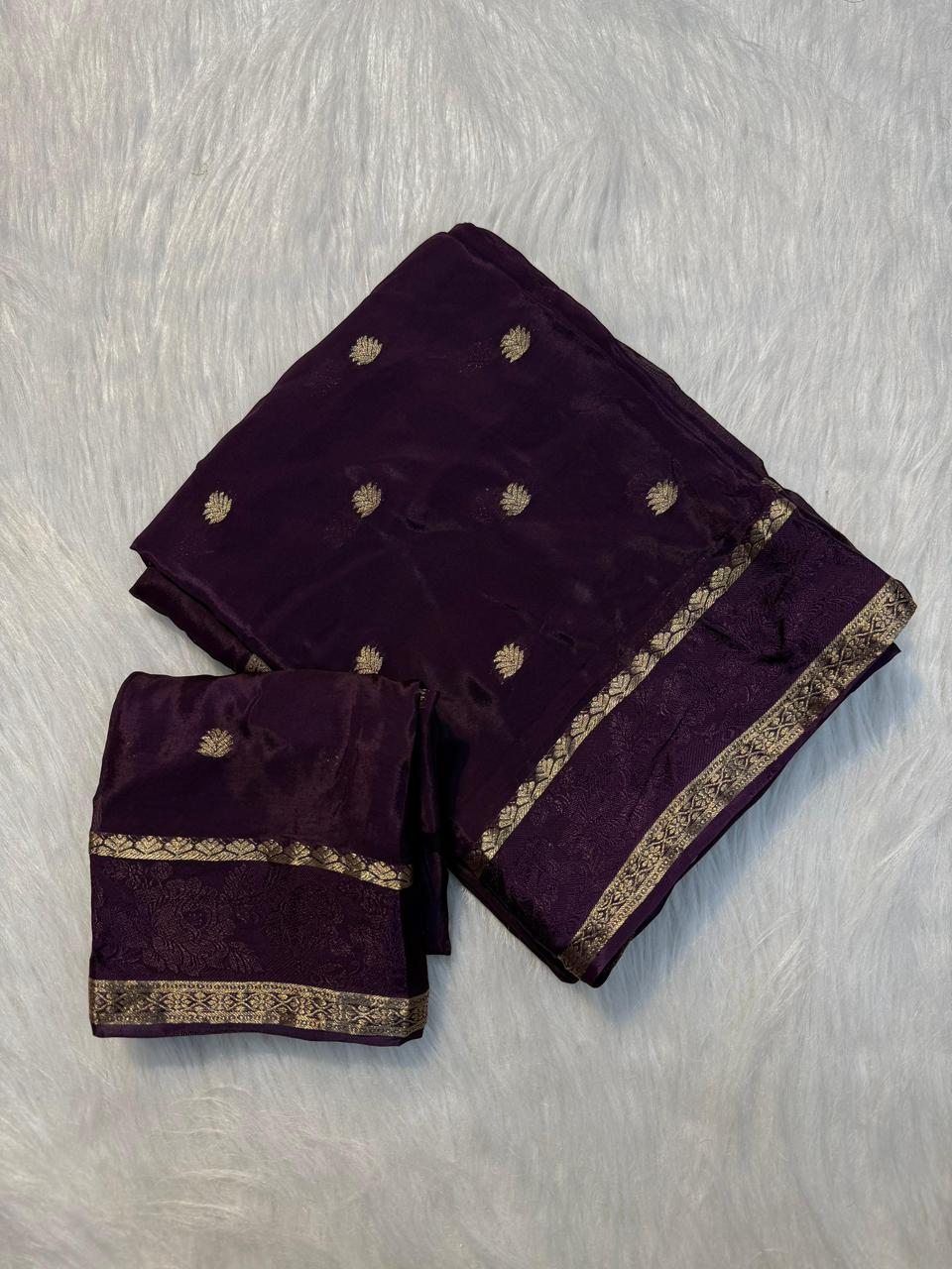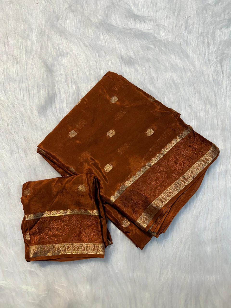 Viscose Chinnon Saree With All Over Golden Butta, An Elegant Border, And a Running Blouse
